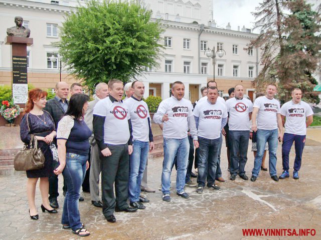 У неділю вже звичне місце для народних віче та центр народного супротиву режиму Януковича – Площа Героїв Небесної Сотні (площа Театральна) стало місцем проведення незвичного флешмобу депутатів місцевих рад всіх рівнів, у якому взяли участь депутати обласної ради з усіх фракцій та позафракційні, депутати міської ради м. Вінниця та депутати районних рад.