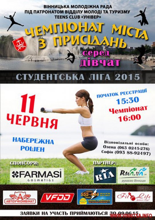 Організатори Чемпіонату міста з присідання серед жінок – Вінницька молодіжна рада та teens-club «Універ» під патронатом відділу у справах молоді та туризму міської ради. Такий захід проходить у місті не вперше, нагадаємо, що минулорічна переможниця присіла 1635 разів.