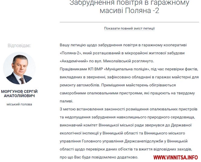 На сайті петицій до Вінницької міської ради з’явилася офіційна відповідь на електронне звернення щодо забруднення повітря в гаражному масиві «Поляна-2». Міський голова Сергій Моргунов зазначив, що муніципальна поліція провела перевірку даної території і виявила саморобні опалювальні пристрої. Наразі фахівці з’ясовують законність їх встановлення.