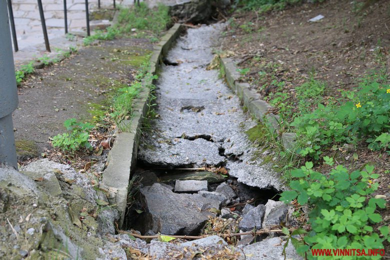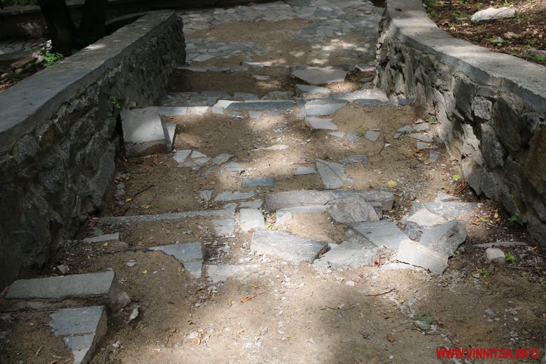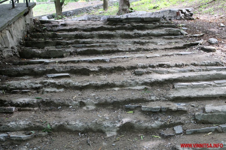 Найбільше привертають увагу сходи, які розташовані ближче до колишнього пляжу, вони повністю зруйновані, частини розкидані, а люди обходять цю небезпечну територію протоптаними стежками.