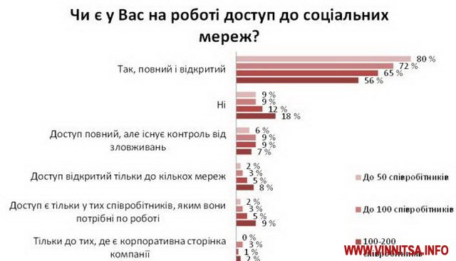 У 70% українських офісів відвідування співробітниками соціальних мереж ніяк не контролюється. Ще 7% офісних працівників зазначили, що мають доступ до Фейсбуку, Вконтакті, Твіттера та інших у робочий час, проте існує контроль від зловживань. А ось у кожній десятій компанії доступ до соцмереж взагалі блокують.
