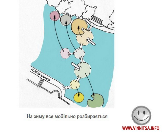 Олександр Коротких, Максим Крамар та Артем Кужель пропонують з’єднати набережну «Рошен» з островом Кемпа, але не звичайним понтонним мостом, як це було раніше, а островами-конструкторами. Вони не закриватимуть шоу фонтану і красиву підсвітку на центральному мосту. На зиму – складатимуться.