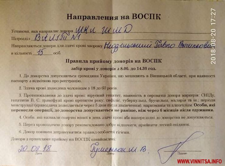 21 серпня до Вінницької обласної станції переливання кров прийшов десяток місцевих жителів. Небайдужі люди здали кров для порятунку мешканця Тернопільської області Павла Недзельського. 19 серпня він, та ще семеро тернопільчан, потрапили в ДТП на Вінницькій окружній.