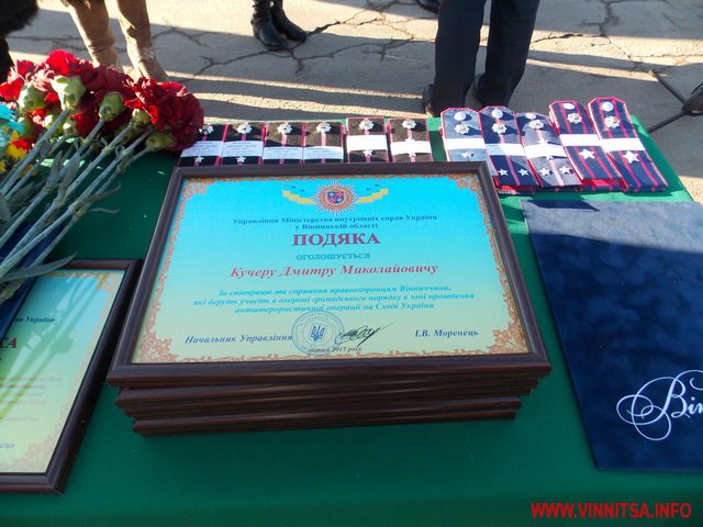 Деяким бійцям присвоїли чергові звання. Батькам і дружинам вручили листи-подяки, також вручили подяки і водіям, які возять вінницьких міліціонерів у небезпечні відрядження.