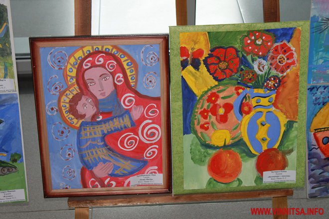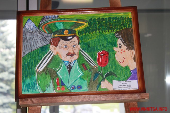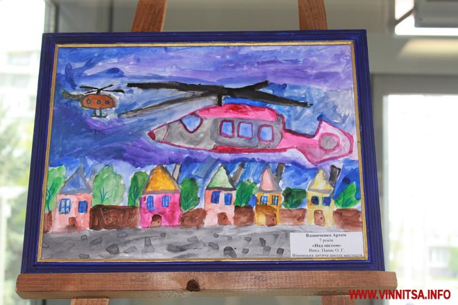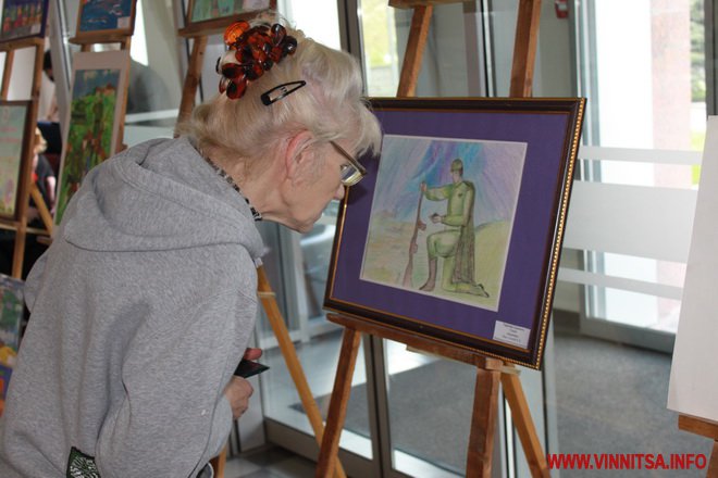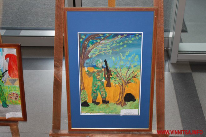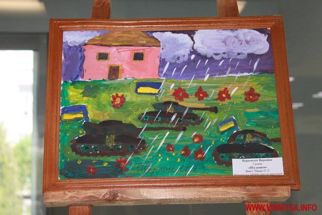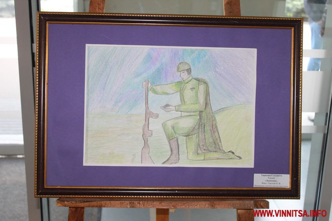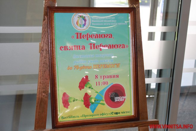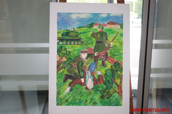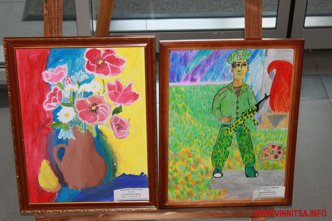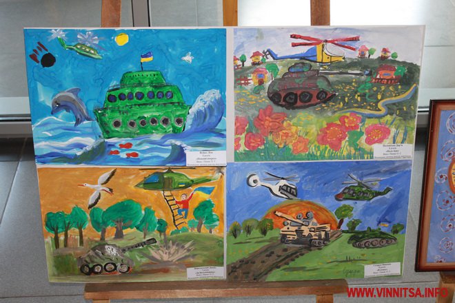 Так у Прозорих офісах розмістили експозиції, присвячені Дню перемоги. Дитячі малюнки виконані фарбами і олівцями. На них – безстрашні воїни, мирне небо і Україна.