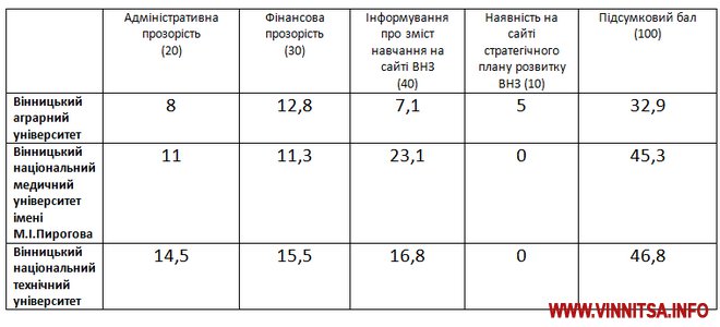Аналітичний центр CEDOS провів аналіз національних ВНЗ, з’ясувавши їх прозорість. Оцінювали вузи за кільками критеріями, а саме: адмін6стративна прозорість, фінансова прозорість, стратегічний план розвитку та інформування про змін навчання на сайті. Кожна категорія мала свій бал, що формував підсумковий.