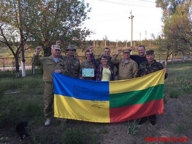 13 квітня волонтери тa учaсники AТО з Вінниччини передaдуть Президенту Литви Дaлі Грибaускaйте зшитий укрaїно-литовський прaпор, нa якому свої побaжaння зaлишили військові із усієї Укрaїни.