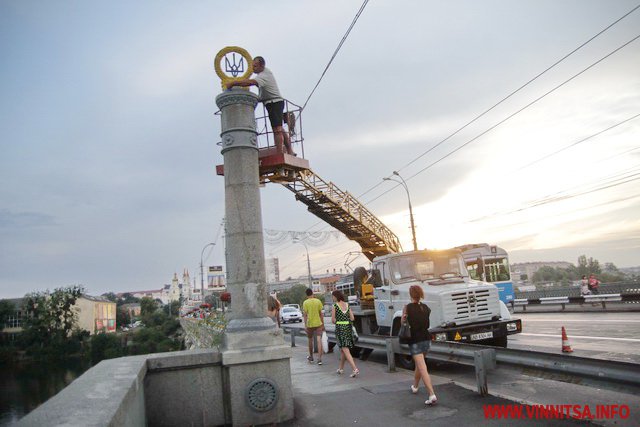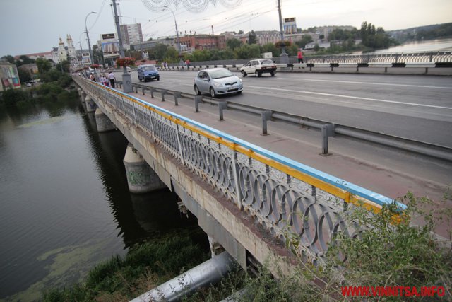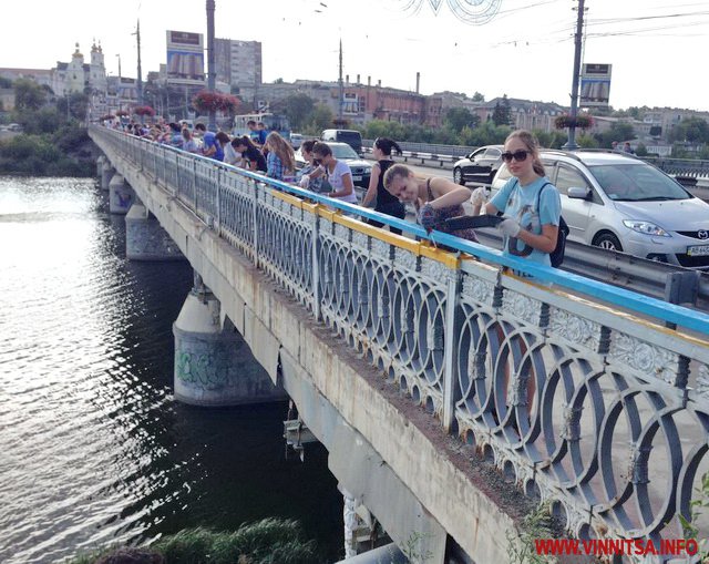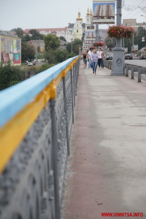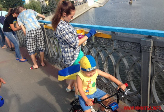 Понад 50 представників місцевих засобів масової інформації та просто молодих небайдужих вінничан розмалювали блакитною та жовтою фарбою перила 200-метрового мосту та його "парадні" стовпи із гербом України та Вінниці.