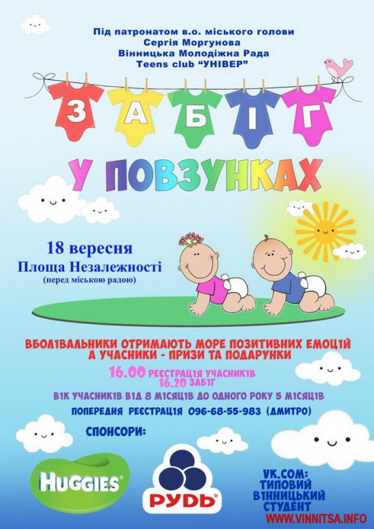 18 вересня у Вінниці на майдані Незалежності відбудеться «Забіг у повзунках». До участі запрошують малюків від 8 місяців до одного року і п’яти місяців.