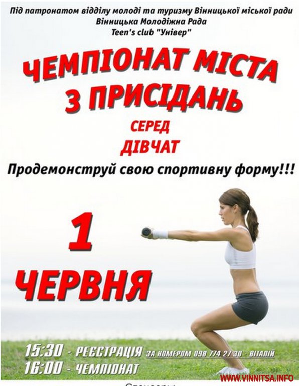1 червня у Вінниці відбудеться щорічний Чемпіонат з присідання серед дівчат. До участі запрошують команди складом по три людини.