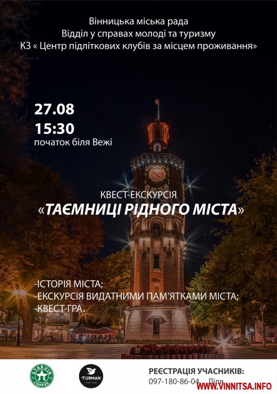 27 вересня студенти перших курсів можуть взяти участь у екскурсії по місту Вінниці. Захід «Пізнавай Вінницю з нами» та квест – екскурсію «Таємниці рідного міста» стартують о 15:30 на площі Європейській.