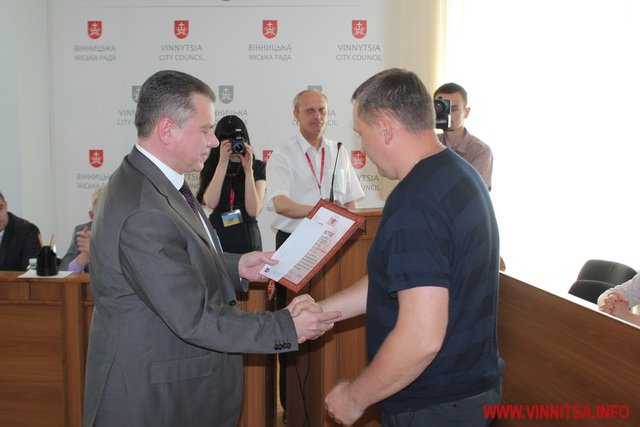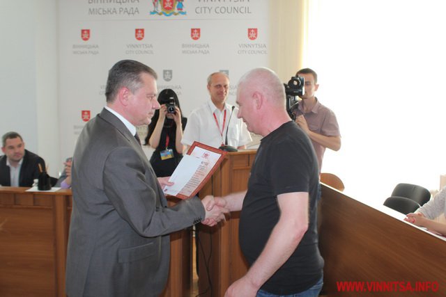 21 травня перед засіданням виконкому міської ради відзначили вінницьких волонтерів, які активно допомагають військовим на Сході. Окрім гуманітарних вантажів вони відправляють у зону АТО автомобілі, в тому числі і машини швидкої допомоги. Цих людей привітав в.о. міського голови Сергій Моргунов та вручив їм грамоти і грошові винагороди.