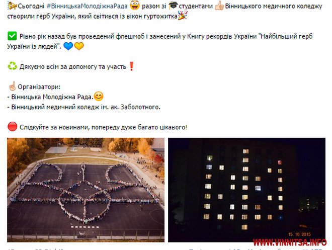 Ця патріотична акція присвячена святкуванню Дню захисника України. До речі, рівно рік тому ми організували флешмоб, занесений у Книгу рекордів України у номінації «наймасштабніший герб України з людей», - розповів представник Вінницької молодіжної ради Артем Шевчук.