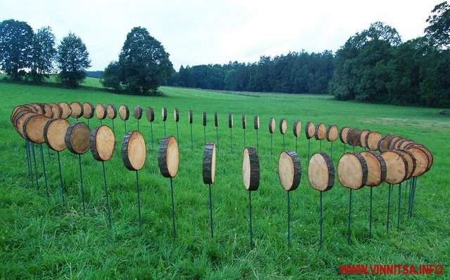 - Цікавим експериментом з особливостями дерева, як матеріалу, став проект Катаржини Щипіюр, - говорить Олександр Никитюк. - Художниця побудувала коло круглих зрізів стволів дерева таким чином, ніби вони зависли у повітрі над травою зеленого поля. В лісі була створена своєрідна відповідь - мала версію об`єкту.