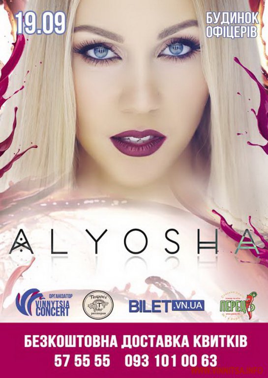 Вінницький концерт співачки ALYOSHA, який мав відбутися 28 квітня о 19.00 у Будинку офіцерів, в силу непередбачуваних обставин переноситься на 19 вересня.