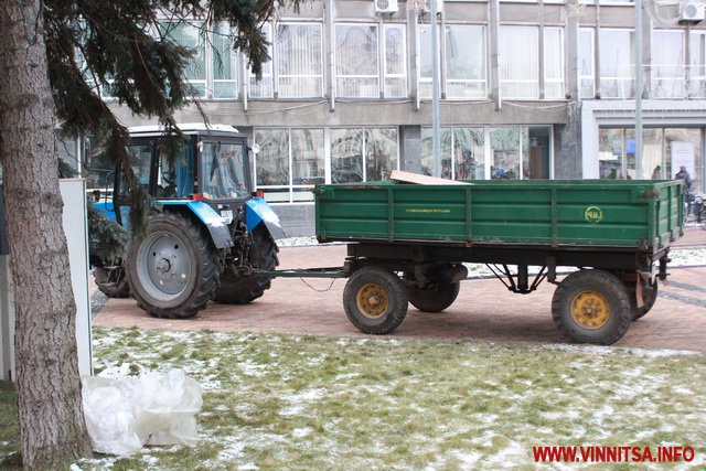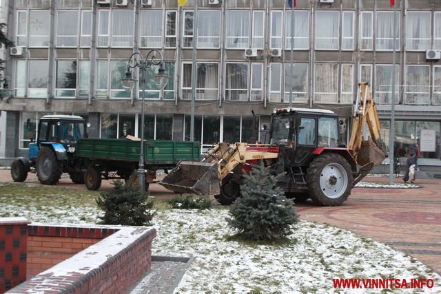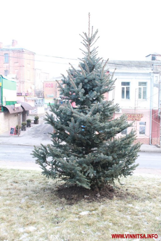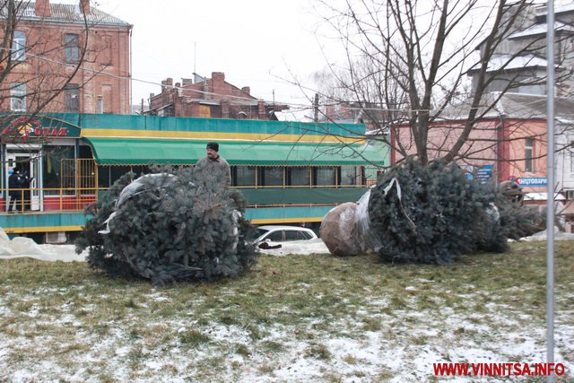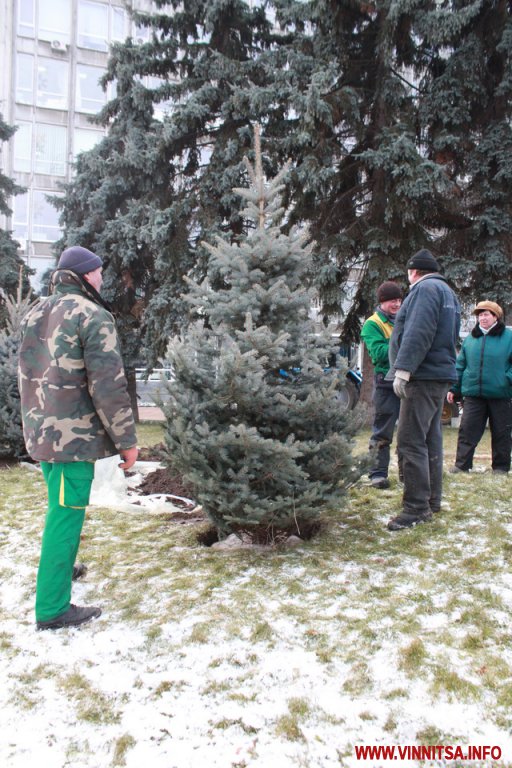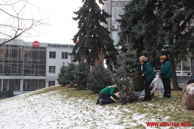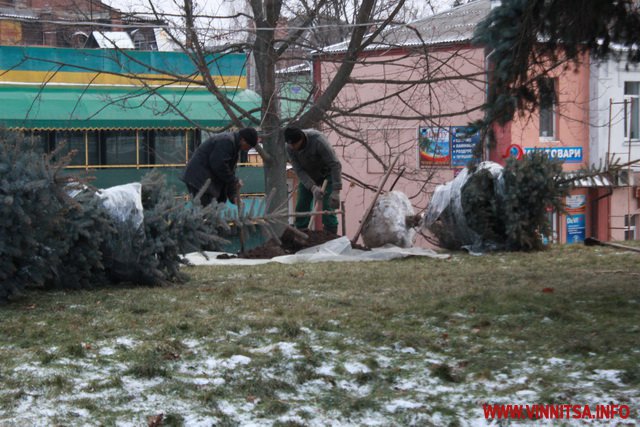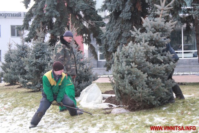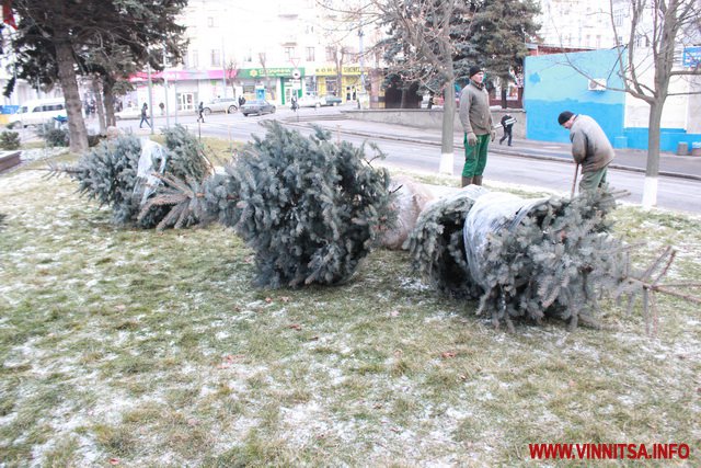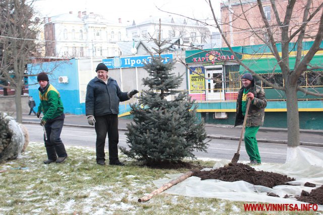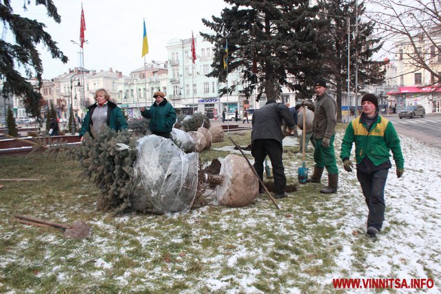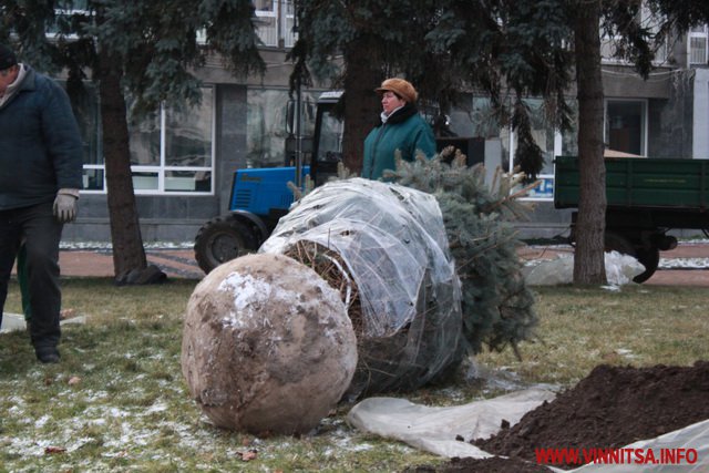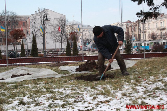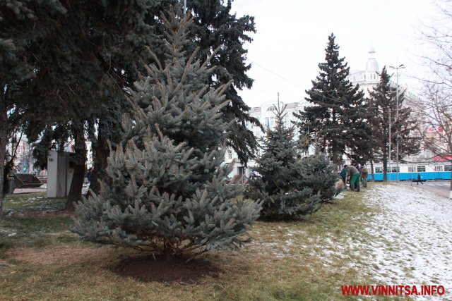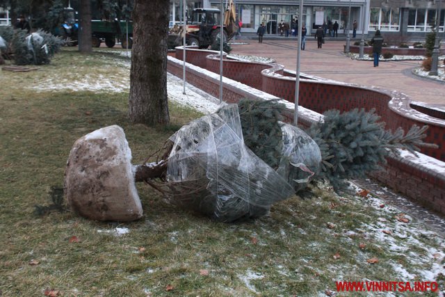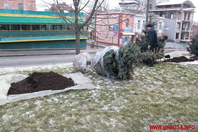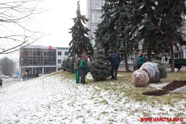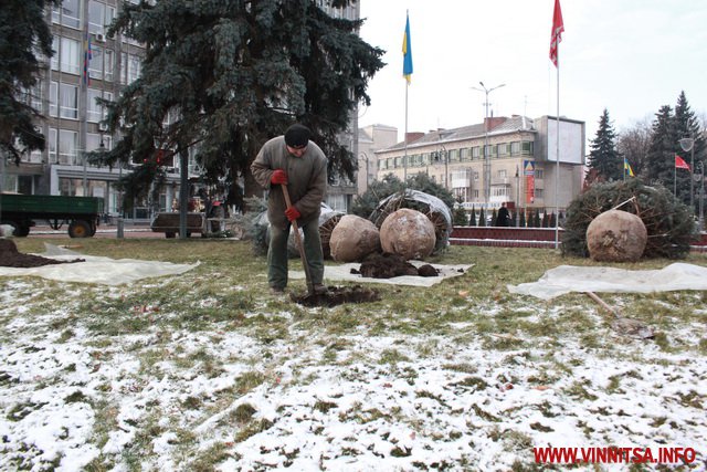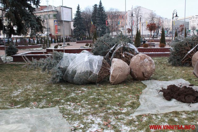 27 листопада на майдані Незалежності перед Вінницькою міською радою висаджують ялинки. Всього їх має бути 11. Всі деревця однакової висоти.