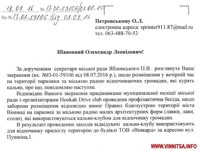 У відповіді на звернення, повідомили, що муніципальна поліція провела профілактичні бесіди з організаторами «Hookah Drive club» і дозволили їм відпочивати лише на території, прилеглій до будівлі на Пушкіна,1.