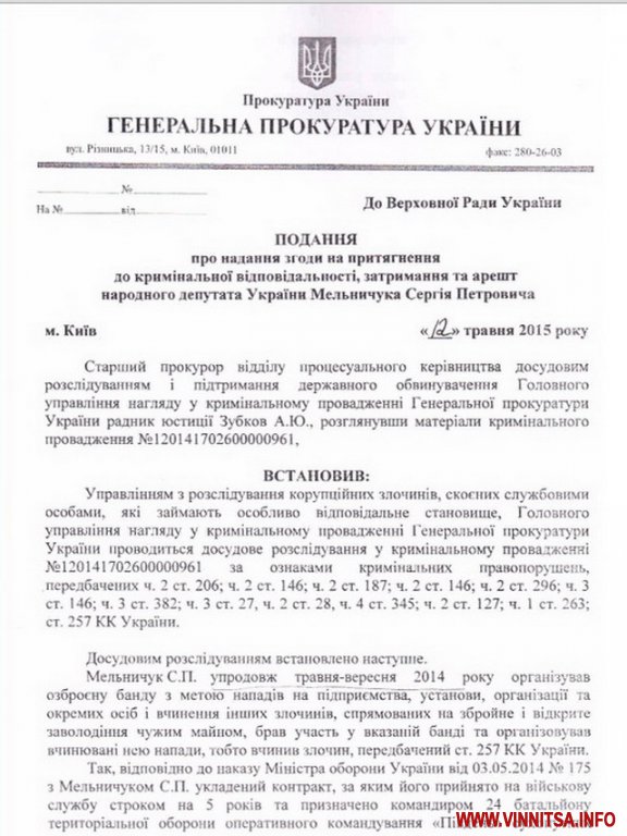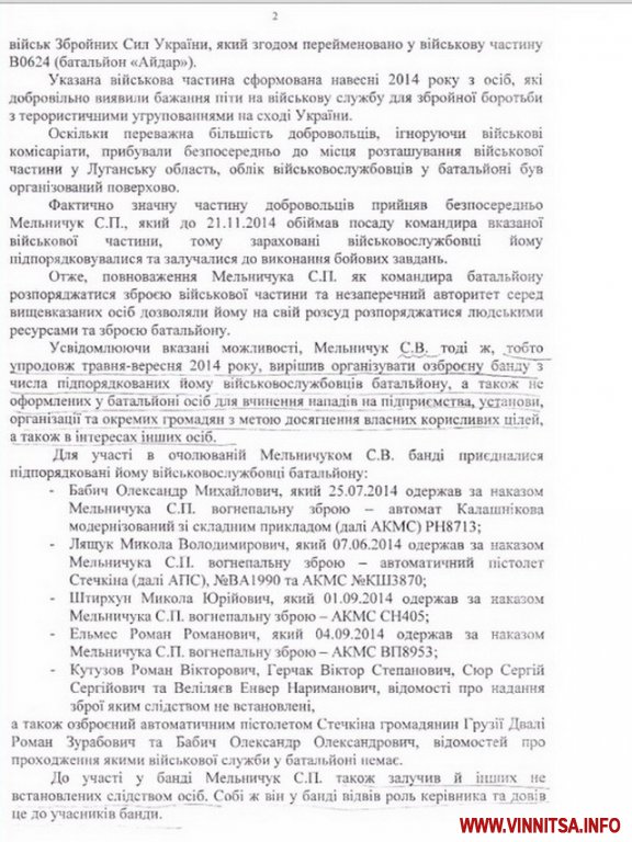 Як зазначено у документі, досудове слідство встановило, що Мельничук «упродовж травня-вересня 2014 року організував озброєну банду з метою нападів на підприємства, установи організації та окремих осіб і вчинення інших злочинів, спрямованих на збройне і відкрите заволодіння чужим майном, брав участь у вказаній банді та організовував вчинювані нею напади».
