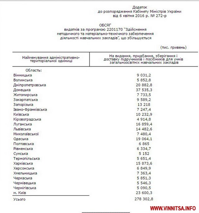 Зокрема, обсяг видатків на видання, придбання, зберігання і доставку підручників і посібників для учнів загальноосвітніх навчальних закладів Вінницької області становить 9031,2 тис. гривень.