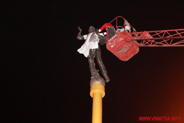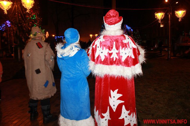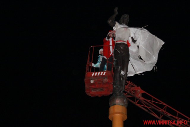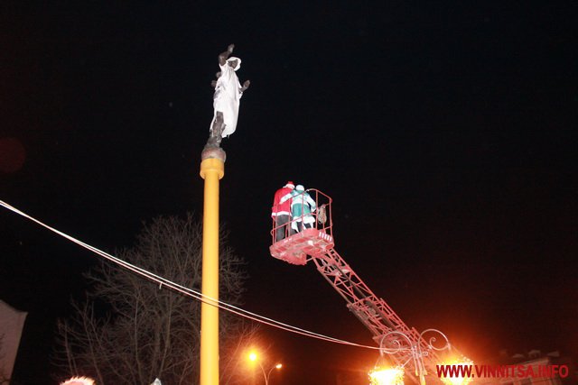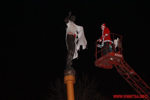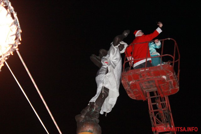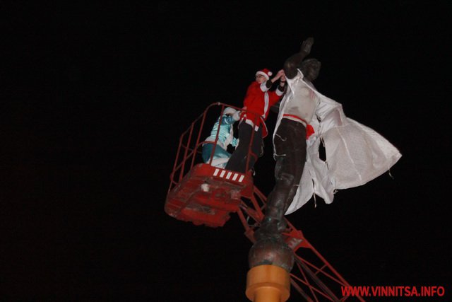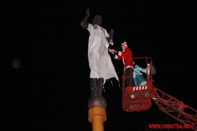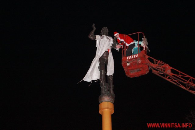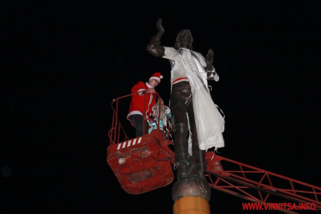 Вчора ввечері працівники департаменту культури міськради в костюмах Діда Мороза та Снігурки за допомогою підйомника одягали пам’ятник