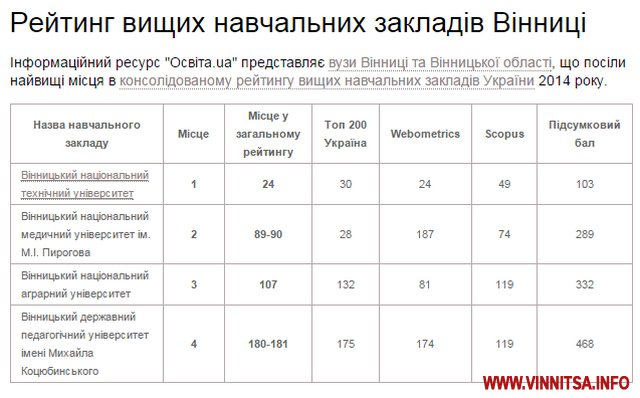 Став відомий рейтинги вищих навчальних закладів областей та обласних центрів. У Вінницькій області було досліджено дев’ять вищих навчальних закладів. З них до рейтингу найкращих ВНЗ увійшло чотири, серед них – Педагогічний університет. Серед Вінницьких ВНЗ він – на четвертому місці.