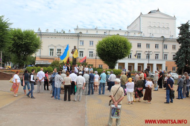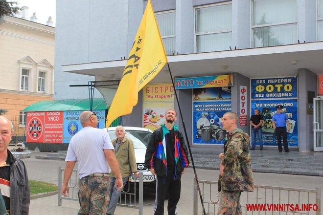 13 липня представники вінницького «Правого сектору» зібрали на площі Небесної сотні, аби підтримати своїх товаришів у Мукачево. На анонсований ще вчора мітинг прийшли близько двох десятків осіб, з яких у камуфляжі та з шевронами «ПС» лише п’ятеро. Інші – «популярні» останнім часом «активісти пенсійного віку».