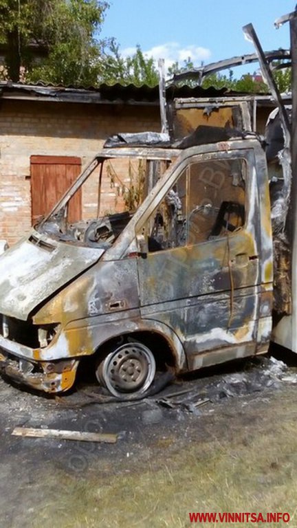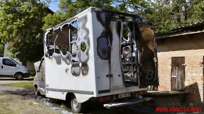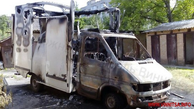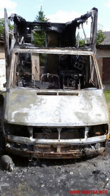 У Вінниці зловмисники спалили автомобіль вінницькому волонтеру. Сталося це на вулиці Стиценка в ніч на 22 травня. Mercedes Sprinter вигорів дотла.