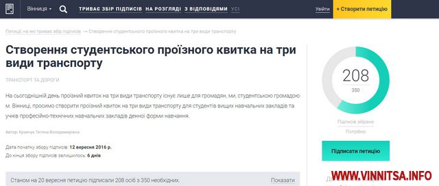 «На сьогоднішній день проїзний квиток на три види транспорту існує лише для громадян, ми, студентською громадою м. Вінниці, просимо створити проїзний квиток на три види транспорту для студентів вищих навчальних закладів та учнів професійно-технічних навчальних закладів денної форми навчання», - зазначено в петиції.