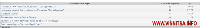 Центральна виборча комісія оприлюднила результати голосування на виборах 25 жовтня, відповідно до яких у Вінницьку міську раду зайшли 6 партій, а в облраду – 8 політсил. Щодо Вінницької районної ради, то сформували її 6 партій, найбільше представників - від БПП «Солідарність» і «Батьківщини», найменше мандатів отримав «Опозиційний блок».