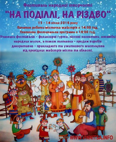 13-14 січня на головній сцені міста, біля ялинки в Центральному парку культури і відпочинку, відбудеться фестиваль народного мистецтва «На Поділлі, на Різдво». Його учасники, фольклорні гурти, пісенні колективи, ансамблі народних музик, виконавці народних пісень міста та області, продемонструють вінничанам різдвяні традиції та звичаї, створять атмосферу справжнього українського свята.