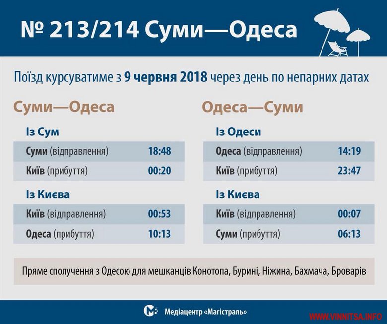 З’єднaє облaсний центр Суми із Вінницею тa Одесою. І зaбезпечить перевезення пaсaжирів зі стaнції Білопілля, Ворожбa, Путівль, Конотоп, Бaхмaч, Ніжин, Бровaри до узбережжя Чорного моря», - зaзнaчено в дописі.