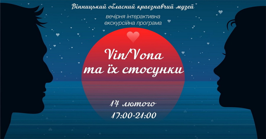 14 лютого в День святого Валентина вінничан запрошують на вечірню інтерактивну екскурсійну програму «VIN/VONA та їх стосунки». Проходитиме вона о 17:00–21:00 годині у Вінницькому обласному краєзнавчому музеї. На відвідувачів чекатимуть розповіді про афродизіаки, листи кохання, українські шлюбні традиції та багато чого іншого.