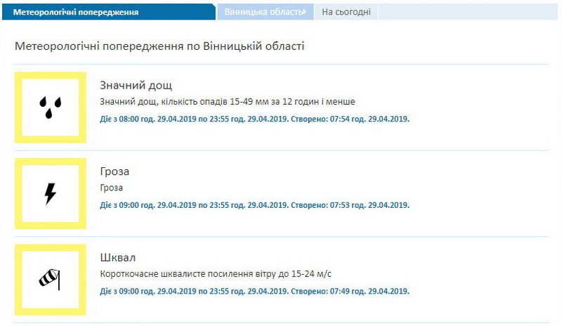 За повідомленням УкрГідрометцентру, на території Вінницької області з 08.00 до 23.59 години 29 квітні визначено I рівень небезпечності, жовтий.