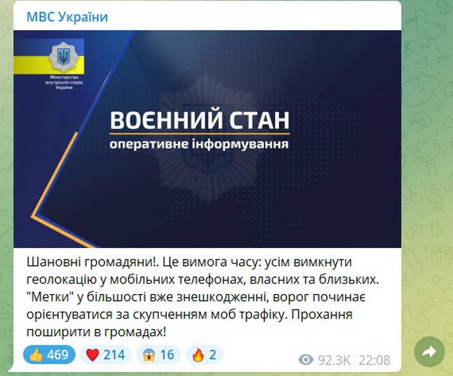 За інформацією МВС України, усі громадяни повинні вимкнути геолокацію в мобільних телефонах – власних та близьких.