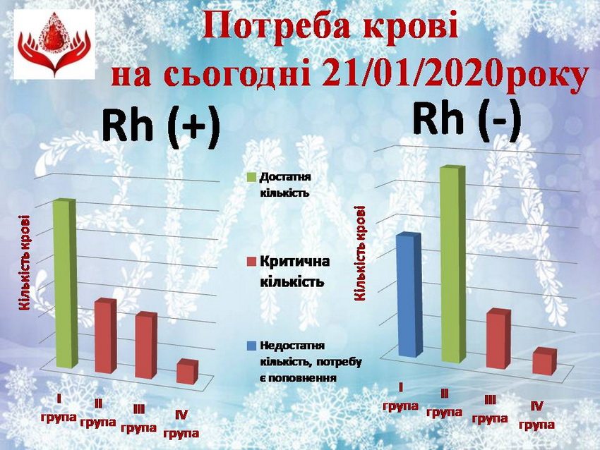 Станом на 21 січня у достатній кількості крові першої групи з резусом (+) та другої групи крові з резусом (-). Катастрофічно не вистачає другої, третьої і четвертої групи крові з резусом (+), а також третьої та четвертої групи з резусом (-). Недостатня кількість першої групи крові з негативним резусом.