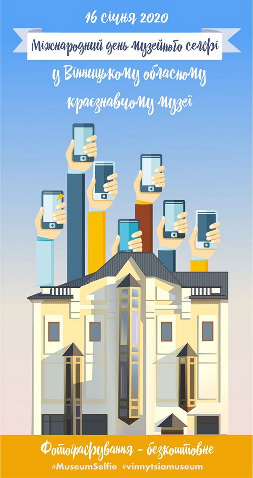 16 січня вінничан запрошують долучитися до міжнародного флешмобу музейних селфі Museum Selfy Day 2020. Потрібно прийти до Вінницького краєзнавчого музею, зробити селфі з улюбленим експонатом та опублікувати фото у соцмережах із хештегом.