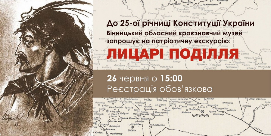 Вінничан запрошують на екскурсію про відважних оборонців краю з найдавніших часів до сьогодення «Лицарі Поділля». Проведуть її у Вінницькому обласному краєзнавчому музеї 26 червня о 15-й годині. Екскурсію проводять до 25-ї річниці Конституції України.