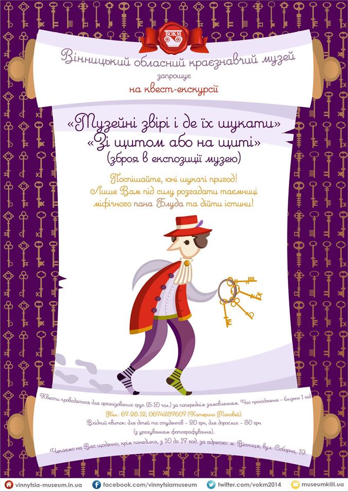 Вінницький обласний краєзнавчий музей запрошує на квест-екскурсії «Музейні звірі і де їх шукати» та «Зі щитом або на щиті» (зброя в експозиції музею). Відвідувачі спробують себе у ролі детектива Шерлока Холмса, археолога Індіани Джонса та розгадуватимуть таємниці міфічного пана Блуда.