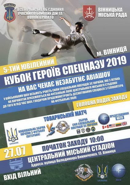 26-27 липня у Вінниці, на «Центральному міському стадіоні» відбудеться турніру з футболу «Кубок Героїв спецназу». Вхід вільний. У товариському матчі гратимуть представники НАТО з Англії, Канади, Америки, Литви.