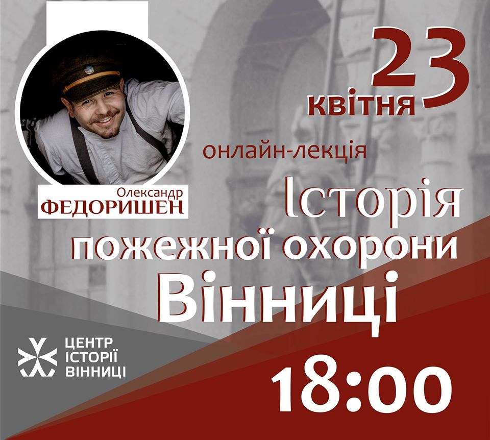 23 квітня вінничанам проведуть лекцію, де розкажуть історію пожежної охорони Вінниці. Організовує лекцію Центр історії Вінниці. У прямому ефірі на сторінці Центру розкажуть, коли виникла перша пожежна команда, чому пожежники носили пишні вуса. Яка роль вінницьких пожежників, у ліквідації наслідків Чорнобильської катастрофи.
