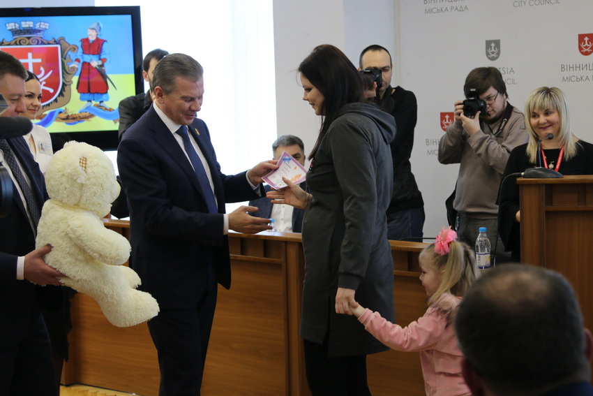 Вінничанка Анастасія Московцева прийшла у сесійну залу зі своєю донечкою, яка народилася у 2015 році. Тоді маля з’явилося на світ саме у День міста, тому батьки отримали презенти від міської ради. Сьогодні ж матуся також забирала подарунки, адже народила синочка у Різдво.