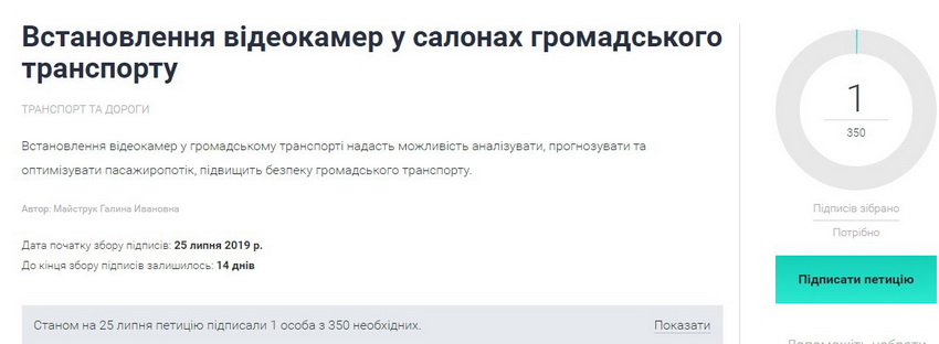 25 липня Галина Майструк зареєструвала петицію до Вінницької міської ради, в якій просить встановити камери відео нагляду в громадському транспорті.
