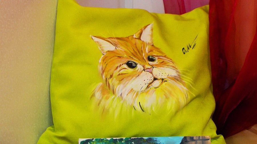 Працює мисткиня фарбами для текстилю, які наносить губкою. Щоб малюнок не «боявся» прання, закріплює його праскою. Так вироби можна буде прати при тридцяти – сорока градусах.