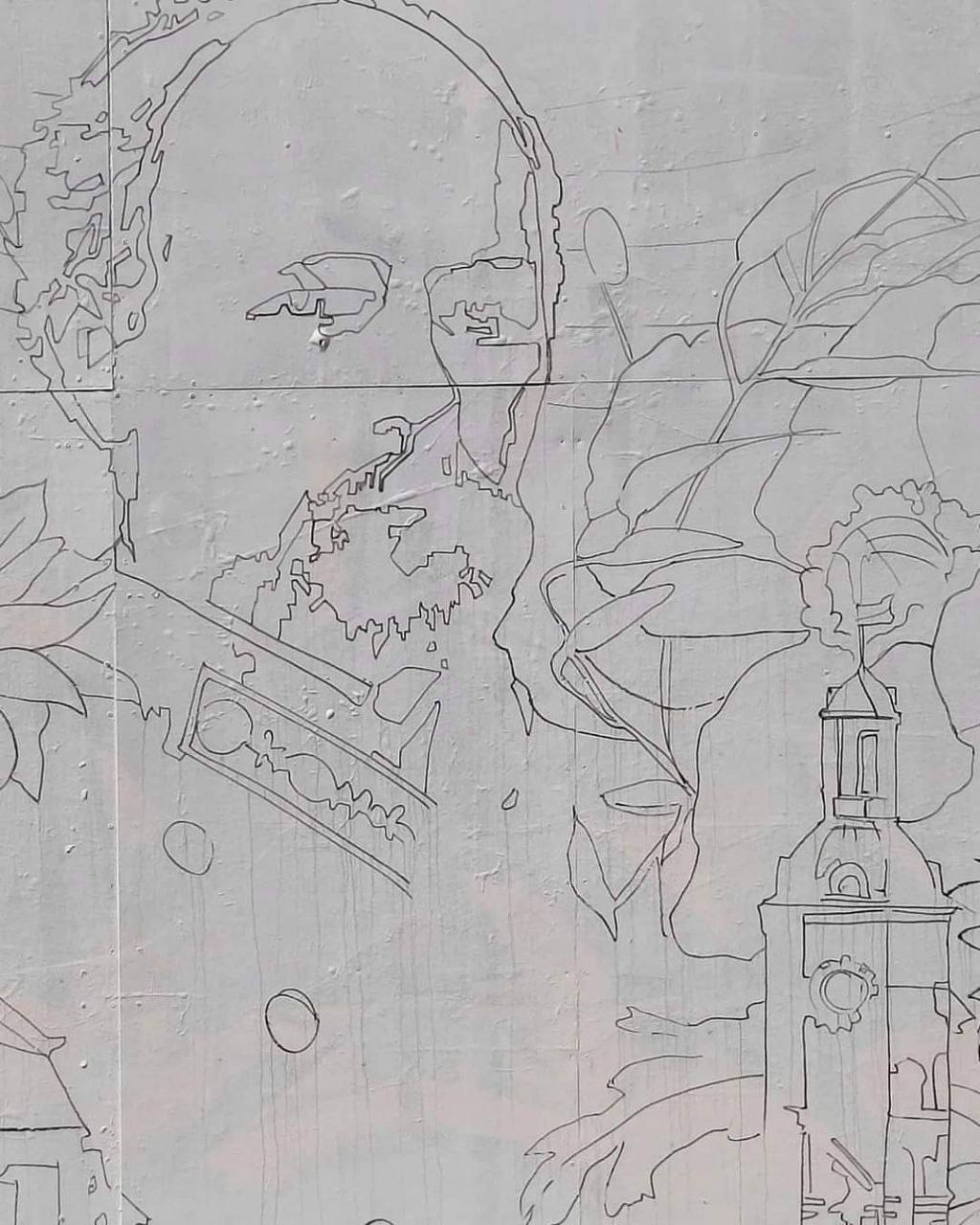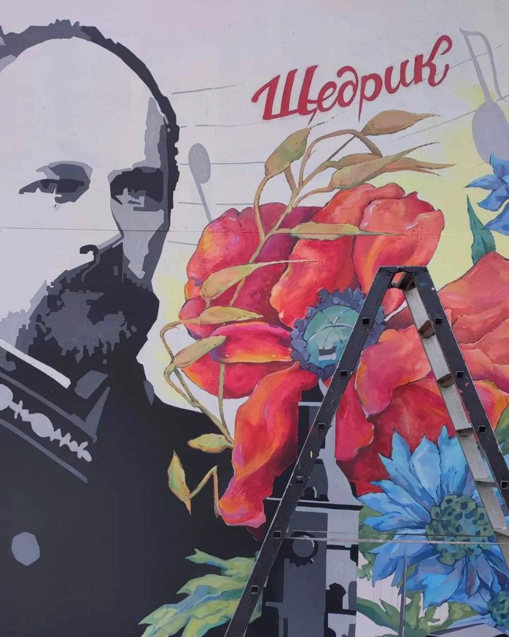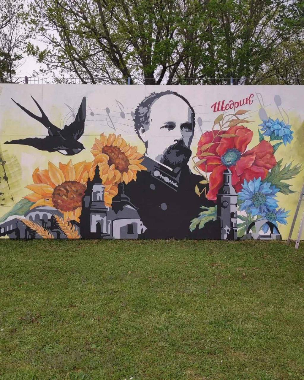 На муралі зображений видатний композитор Микола Леонтович, польові квіти, що проростають з вулиці рідного міста та ластівка, що несе на своїх крилах по світу мелодію Щедрика.