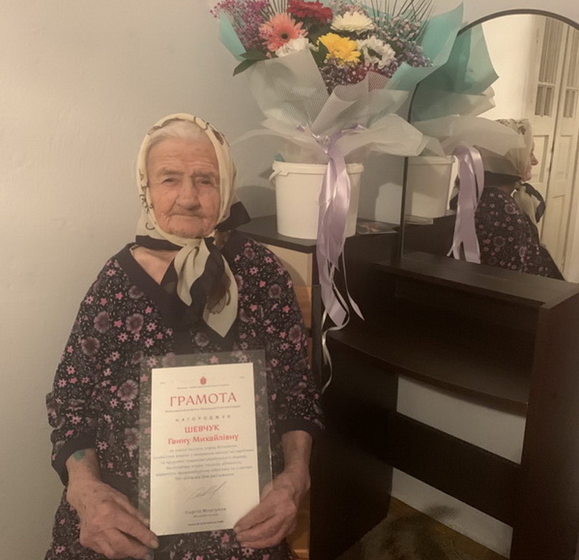 «За значні заслуги перед Вітчизною, багаторічну плідну діяльність, особистий внесок у виховання молоді на героїчних та трудових традиціях українського народу, відданість громадянському обов'язку, Шевчук Ганна Миколаївна нагороджена Почесною грамотою виконавчого комітету Вінницької міської ради та грошовою премією. Бажаємо ювілярці міцного здоров'я на многії літа!», - каже перша заступниця директора департаменту соціальної політики міської ради Наталія Паламарчук.