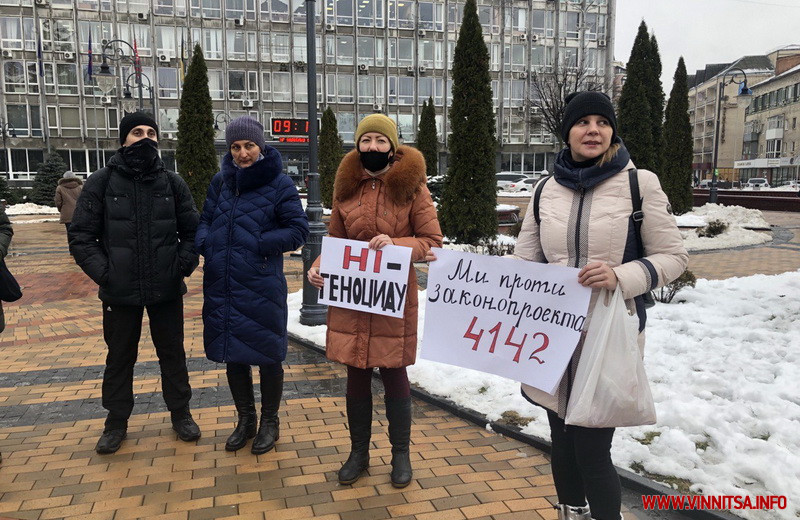 Вранці 4 лютого в центрі Вінниці зібралось два десятки людей з плакатами «Ми проти законопроекту 4241», «ні геноциду», «проти 4142». Вінничани кажуть, що в законопроекті, який сьогодні винесли на голосування у Парламенті, передбачена примусова вакцинація від коронавірусу. Від редакції відразу зазначимо, що люди введені в оману - у вказаному на плакатах законопроекті немає про примусову вакцинацію.