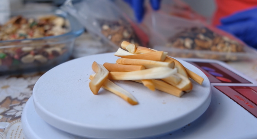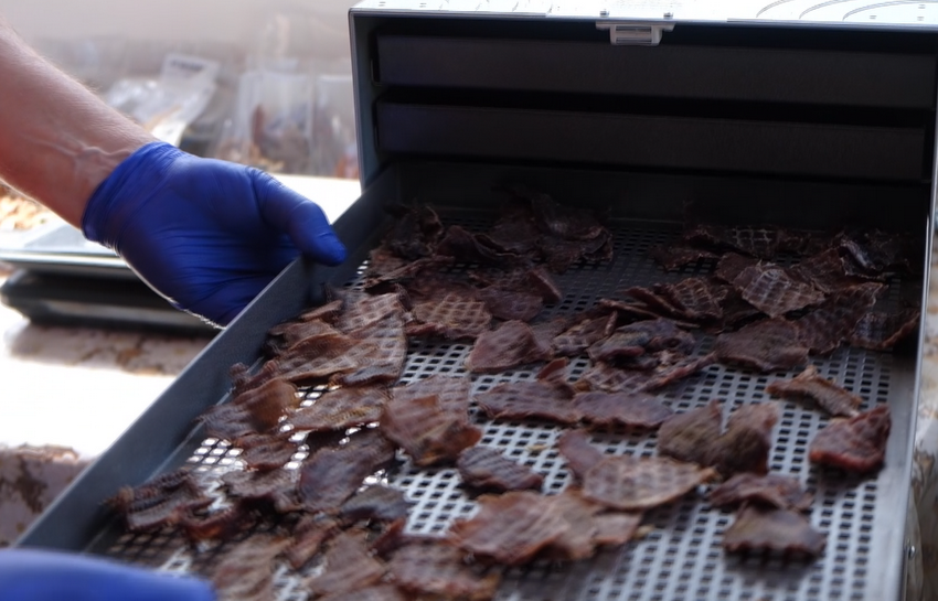 Відбірну яловичину і свинину – 6 годин сушать у дегідраторі. М’ясо, приправлене сіллю та сумішшю перців фасує вакуумна машинка. З кілограма свіжого м’яса виходить 300 грамів чіпсів.