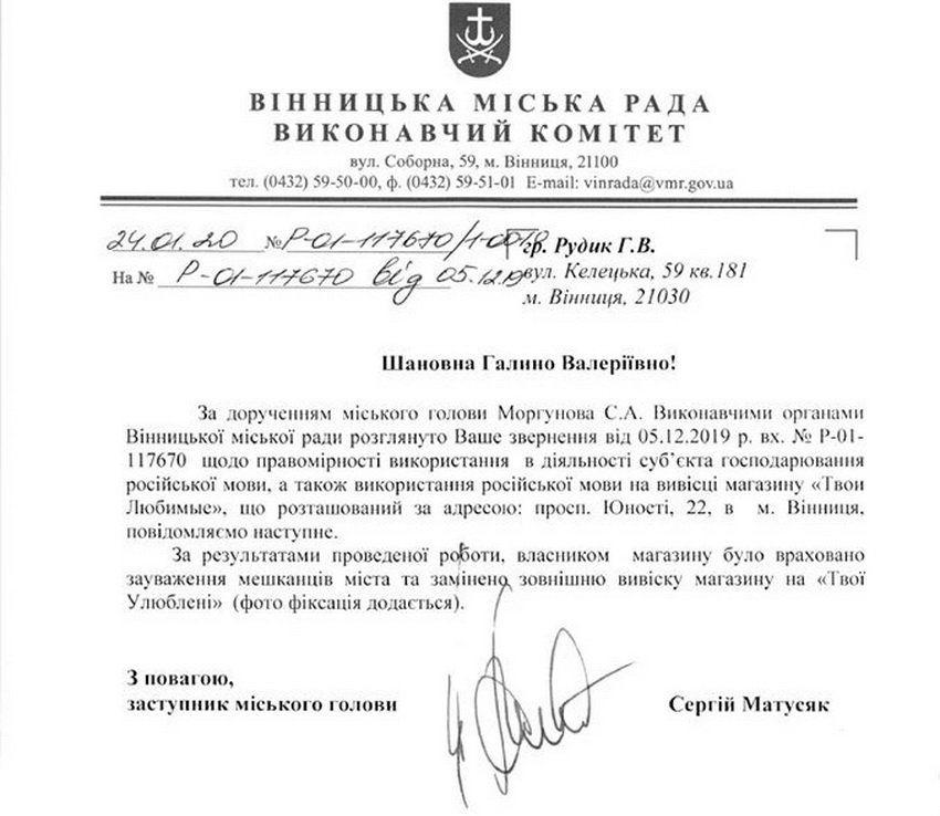 «За результатами проведеної роботи, власником магазину було враховано зауваження мешканців міста та змінено зовнішню вивіску магазину на «Твої улюблені», - йдеться в документі.