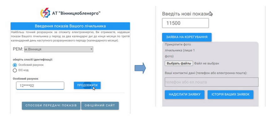 «На сайті ця можливість стає доступною одразу після ідентифікації за EIC-кодом або номером особового рахунку. Щоб створити заявку на корегування показів на сайті введіть фактичні покази лічильника та натисніть кнопку «ЗАЯВКА НА КОРЕГУВАННЯ», потім завантажте фото лічильника, введіть контактний номер телефону або адресу електронної пошти та натисніть «НАДІСЛАТИ ЗАЯВКУ». У разі виконання заявки або її відхилення Вас буде сповіщено через SMS-повідомлення на вказаний номер або електронний лист на вказану поштову скриньку», – розповідають також в компанії.
