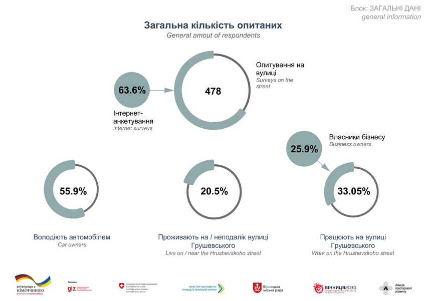 В опитуванні взяли участь майже півтисячі вінничан. З них, 55,9% - автомобілісти, 20,5% люди, які мешкають на вулиці Грушевського або неподалік від неї, ще 33,5% - працюють на цій вулиці.